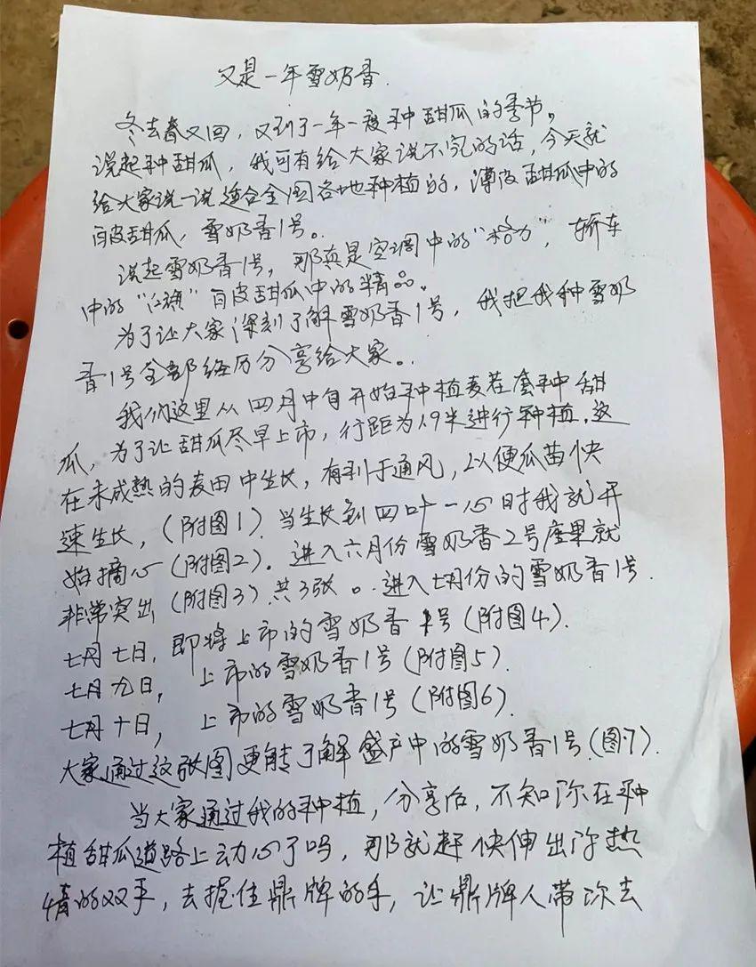 李老板是一位很務(wù)實、很勤奮的人,去年和今年都在麥田套栽了甜瓜,效益不錯。今年參加了鼎牌公司的“拍拍獎”活動,看他認(rèn)真書寫的稿件就讓人敬佩。