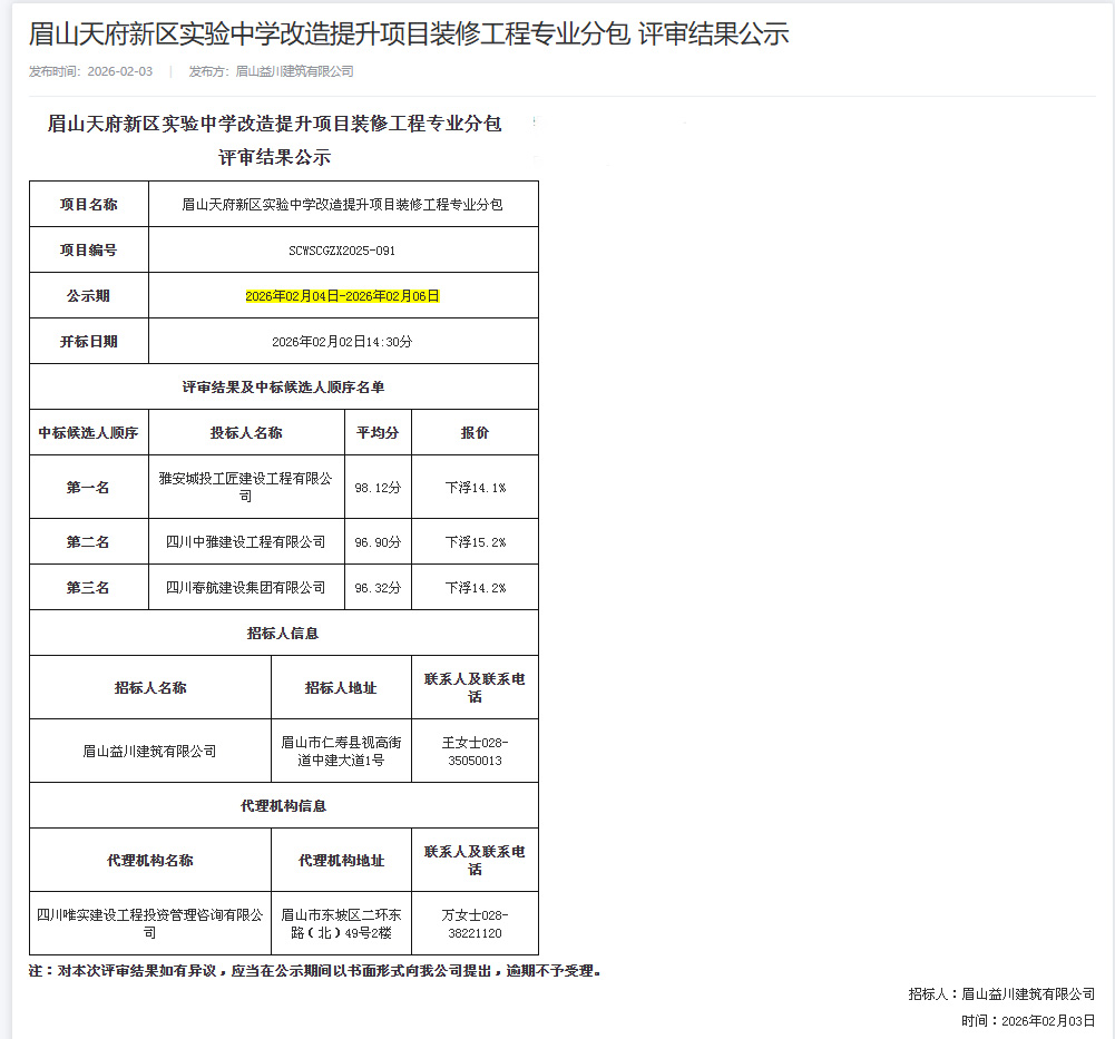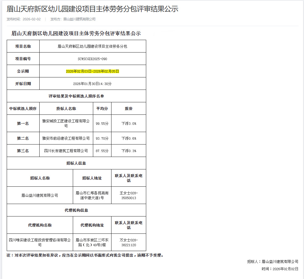 近日,城投工匠公司成功中標“眉山天府新區(qū)幼兒園建設項目主體勞務分包工程”和“眉山天府新區(qū)實驗中學改造提升項目裝修工程專業(yè)分包工程”,中標金額2294萬元。此次中標不僅是公司新年實現(xiàn)的首個重要業(yè)務突破,也是公司首次承接市外項目,標志著跨區(qū)域經(jīng)營實現(xiàn)“零的突破”,為公司發(fā)展迎來“開門紅”。