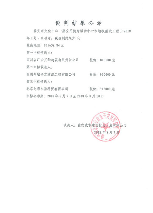 雅安市文化中心一期全民健身活動中心木地板整改工程競爭性談判結(jié)果公示