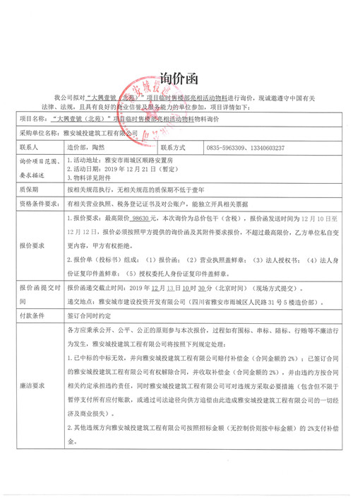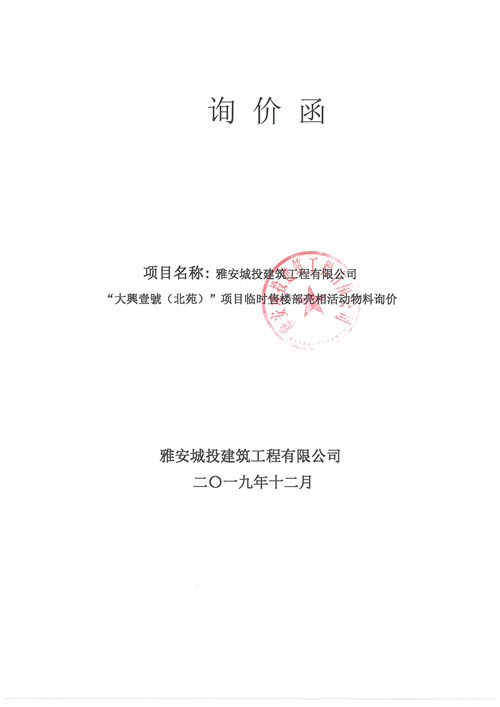 大興壹號(北苑)項(xiàng)目臨時售樓部亮相活動物料詢價(jià)函