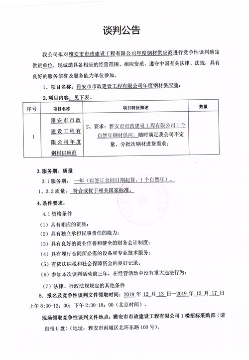 雅安市市政建設(shè)工程有限公司年度鋼材供應(yīng)商競爭性談判公告