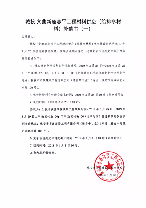 城投·文曲新座總平工程材料供應(yīng)(給排水材料)競爭性談判公告補(bǔ)遺一