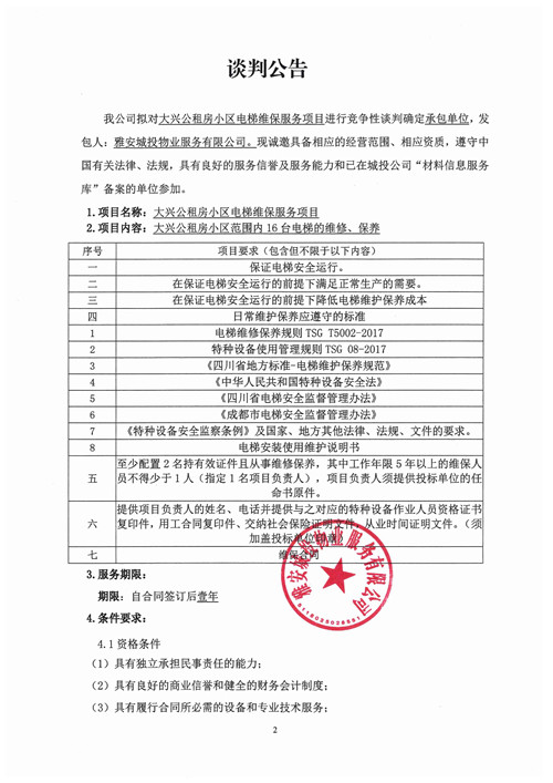 大興公租房小區(qū)電梯維保服務(wù)項目的競爭性談判公告