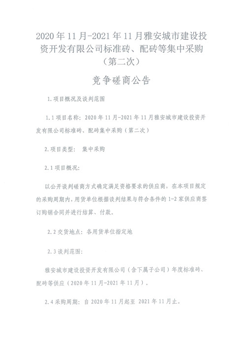 2020年11月-2021年11月雅安城市建設(shè)投資開發(fā)有限公司標準磚、配磚等集中采購(第二次)競爭磋商公告