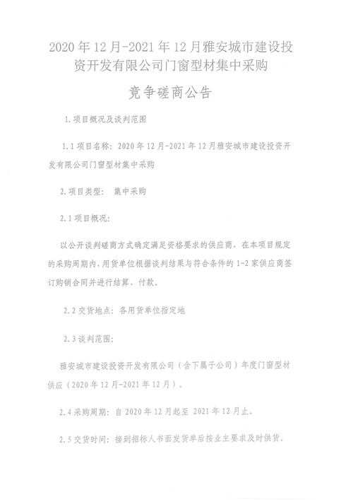2020年12月-2021年12月雅安城市建設(shè)投資開發(fā)有限公司門窗型材集中采購競(jìng)爭(zhēng)磋商公告