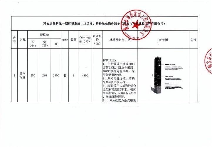 雅安康養(yǎng)新城一期標(biāo)識(shí)系統(tǒng)、垃圾桶、精神堡壘詢(xún)價(jià)清單(雅安市市政建設(shè)工程有限公司)