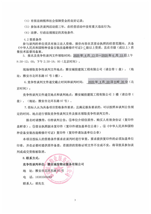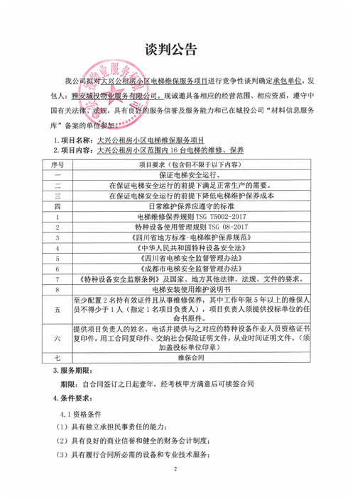 城投物業(yè)公司大興公租房小區(qū)電梯維保服務(wù)項目競爭性談判公告(第二次)