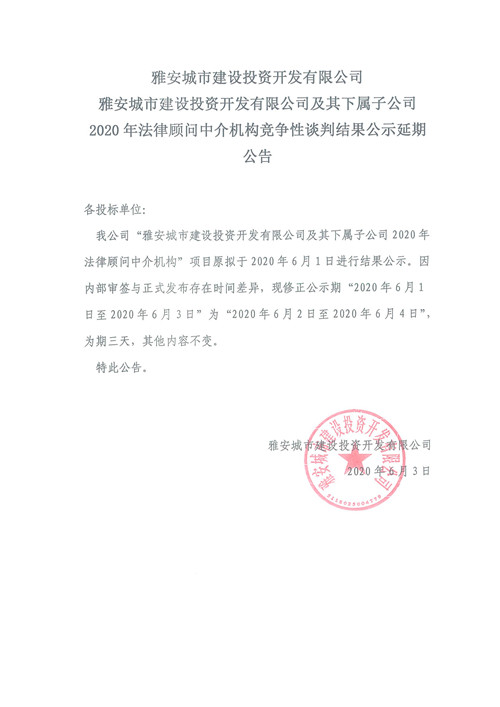 雅安城市建設(shè)投資開發(fā)有限公司及其下屬子公司2020年法律顧問中介機(jī)構(gòu)競(jìng)爭(zhēng)性談判結(jié)果公示延期公告