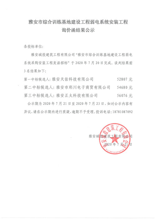 雅安市綜合訓(xùn)練基地建設(shè)工程弱電系統(tǒng)安裝工程詢價函結(jié)果公示