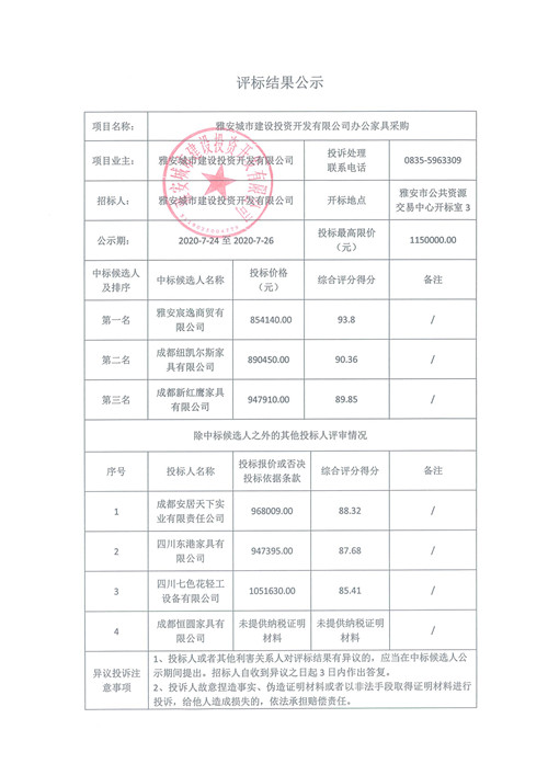 雅安城市建設(shè)投資開(kāi)發(fā)有限公司辦公家具采購(gòu)評(píng)標(biāo)結(jié)果公示