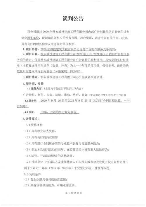2020年雅安城投建筑工程有限公司內(nèi)部廣告制作服務(wù)競爭性談判公告