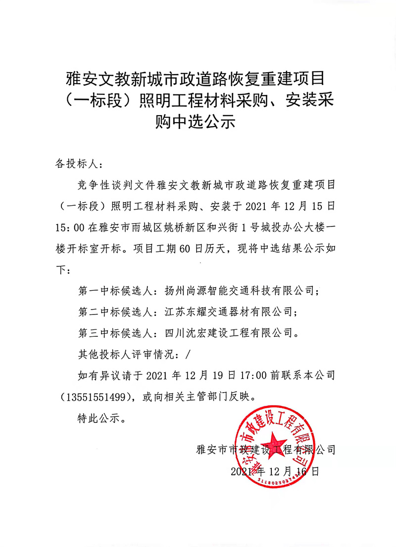 雅安文教新城市政道路恢復(fù)重建項(xiàng)目(一標(biāo)段)照明工程材料采購、安裝采購中選公示