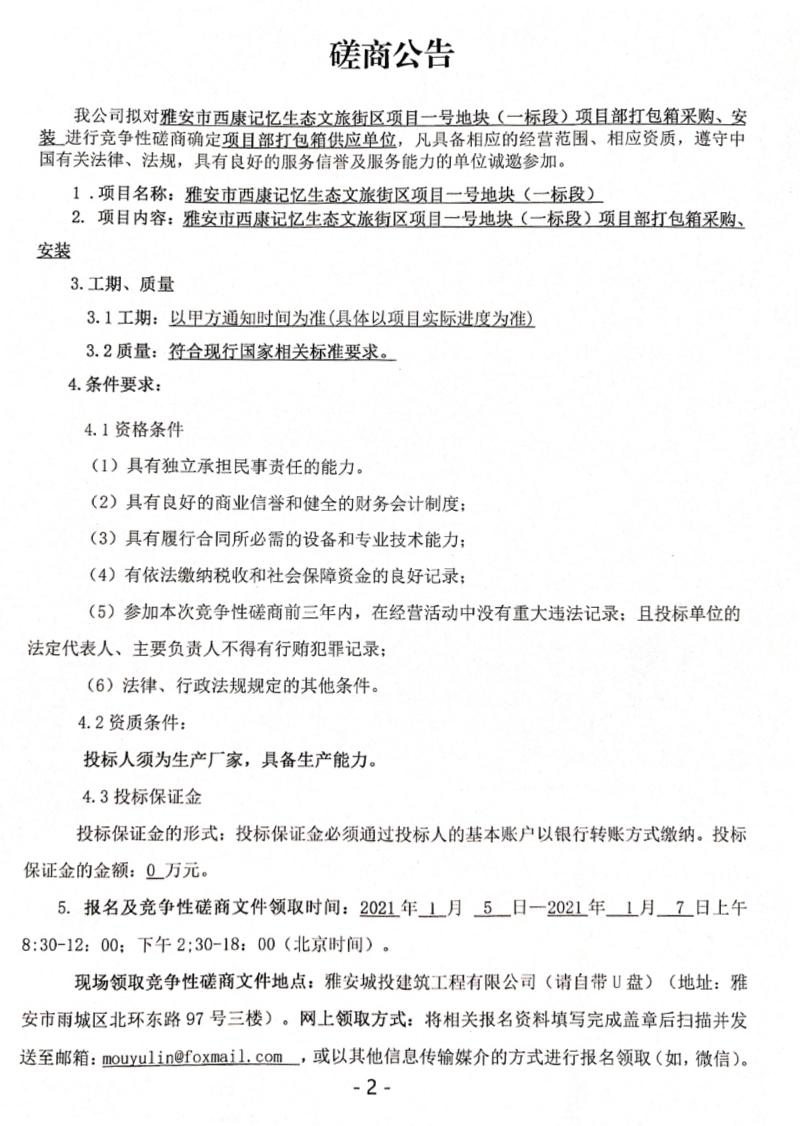 雅安市西康記憶生態(tài)文旅街區(qū)項(xiàng)目一號地塊(一標(biāo)段)項(xiàng)目部打包箱采購、安裝競爭性磋商公告