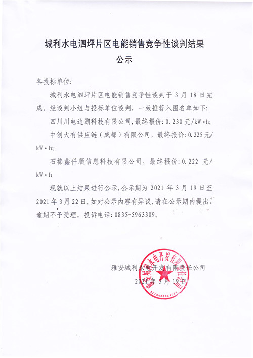 城利水電公司泗坪片區(qū)電站電能銷售競爭性談判結(jié)果公示