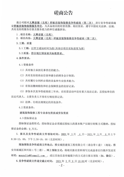 城投建工公司大興壹號(hào)(北苑)樣板房裝飾裝修競(jìng)爭(zhēng)性磋商公告(第二次)