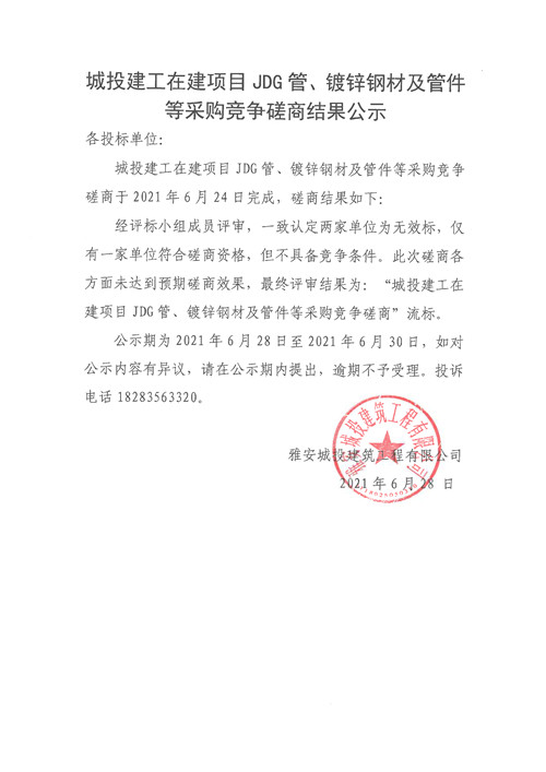 城投建工公司在建項目JDG管、鍍鋅鋼材及管件等采購競爭性磋商結(jié)果公示