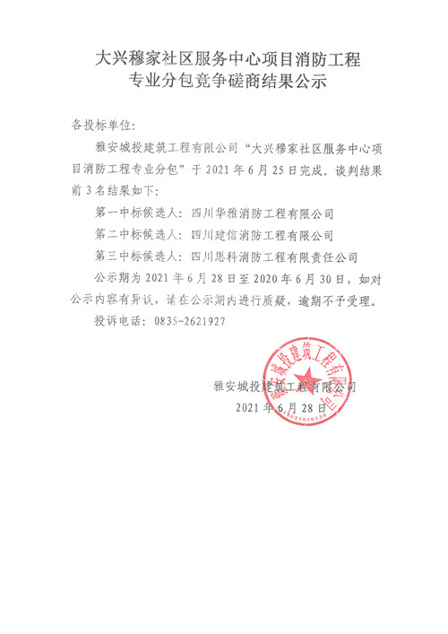 城投建工公司大興穆家社區(qū)服務(wù)中心項(xiàng)目消防工程專業(yè)分包競(jìng)爭(zhēng)性磋商結(jié)果公示