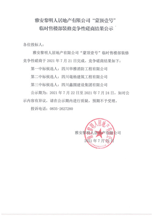 黎明人居公司黎明·蒙頂壹號臨時(shí)售樓部裝飾裝修競爭性磋商結(jié)果公示