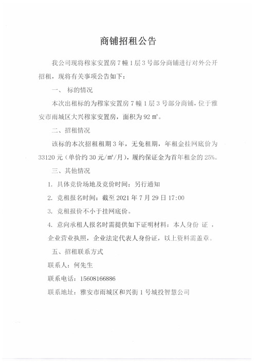 城投智慧公司穆家安置房7幢1層3號(hào)部分商鋪招租公告