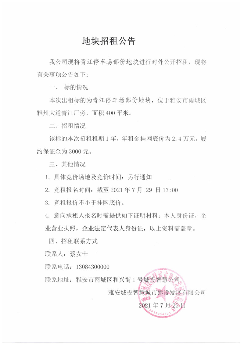 城投智慧公司青江停車場(chǎng)部分地塊招租公告(400㎡)