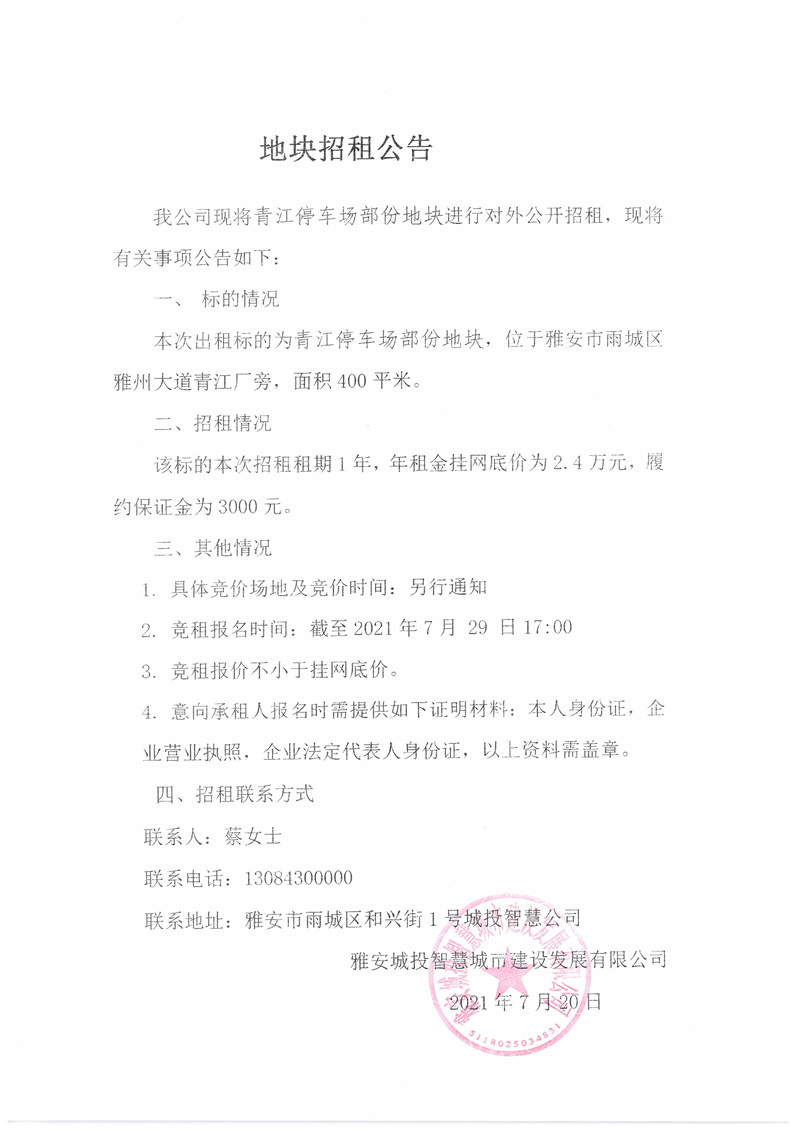 城投智慧公司青江停車(chē)場(chǎng)部分地塊招標(biāo)公告(400㎡)