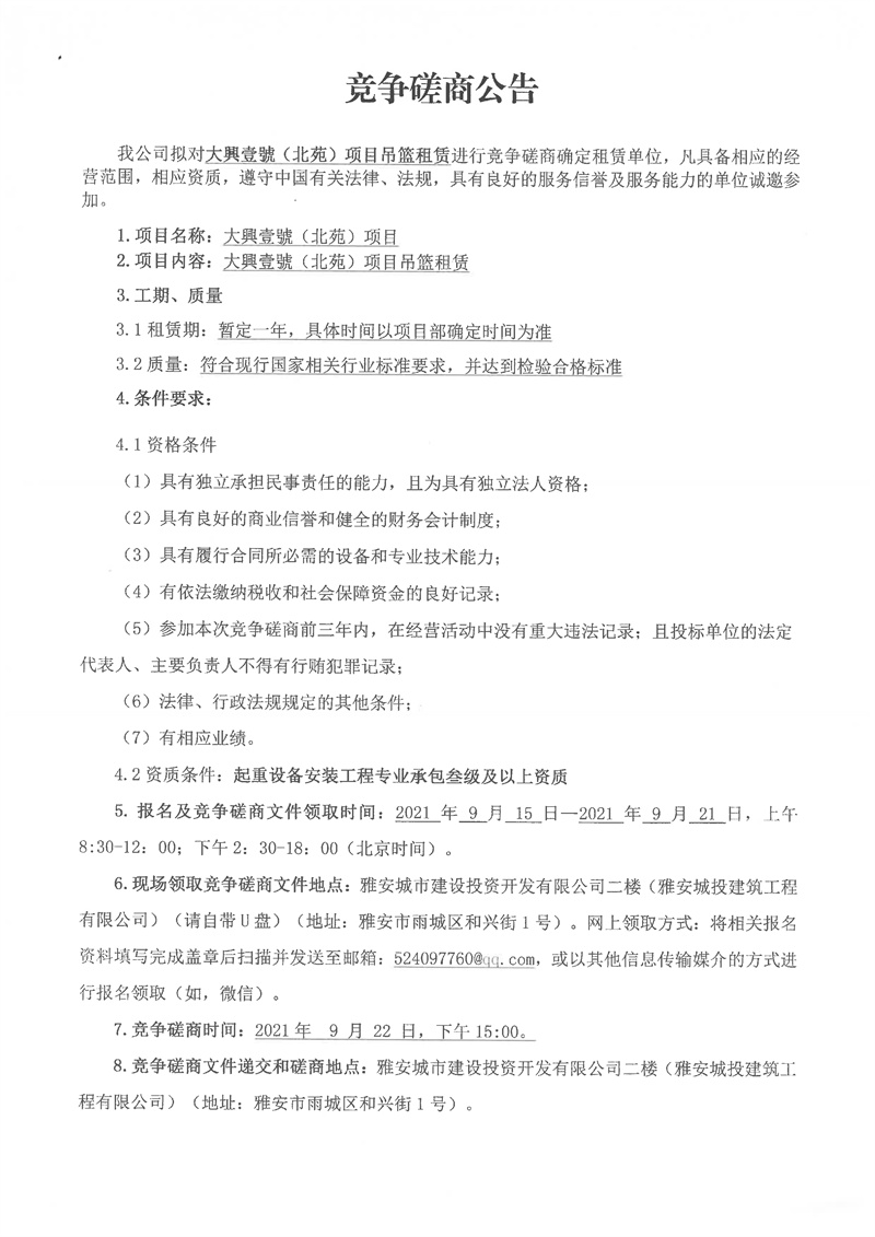 大興壹號(北苑)項(xiàng)目吊籃租賃競爭性磋商公告