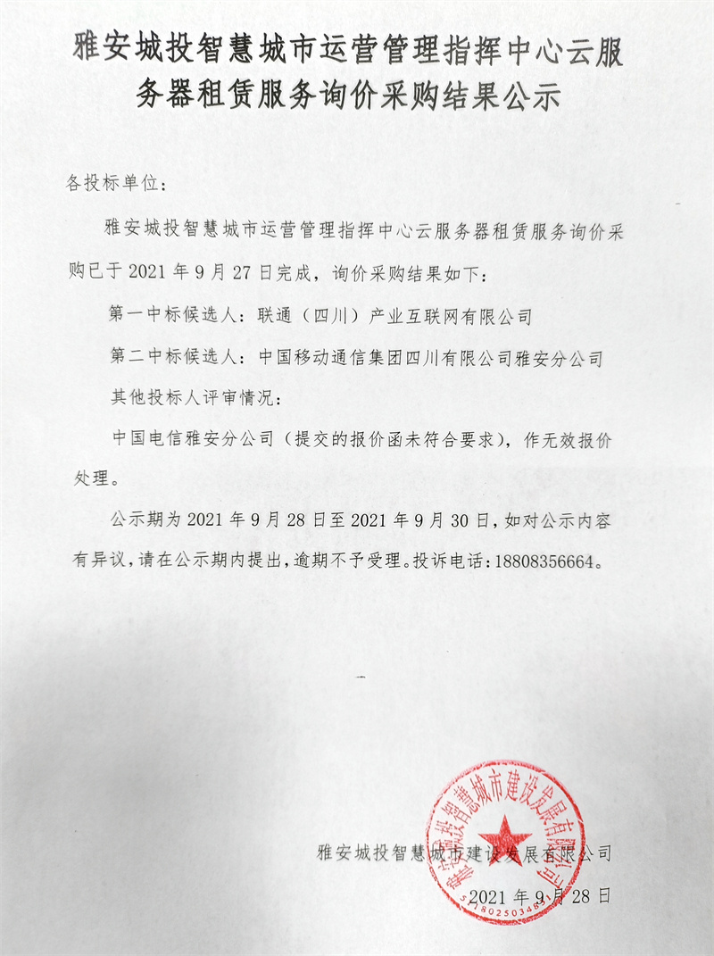 雅安城投智慧城市運(yùn)營(yíng)管理指揮中心云服務(wù)器租賃服務(wù)采購(gòu)詢價(jià)結(jié)果公示