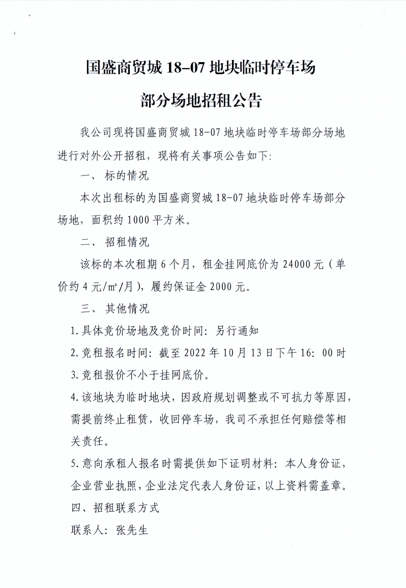 國盛商貿(mào)城18-07地塊臨時停車場部分場地招租公告