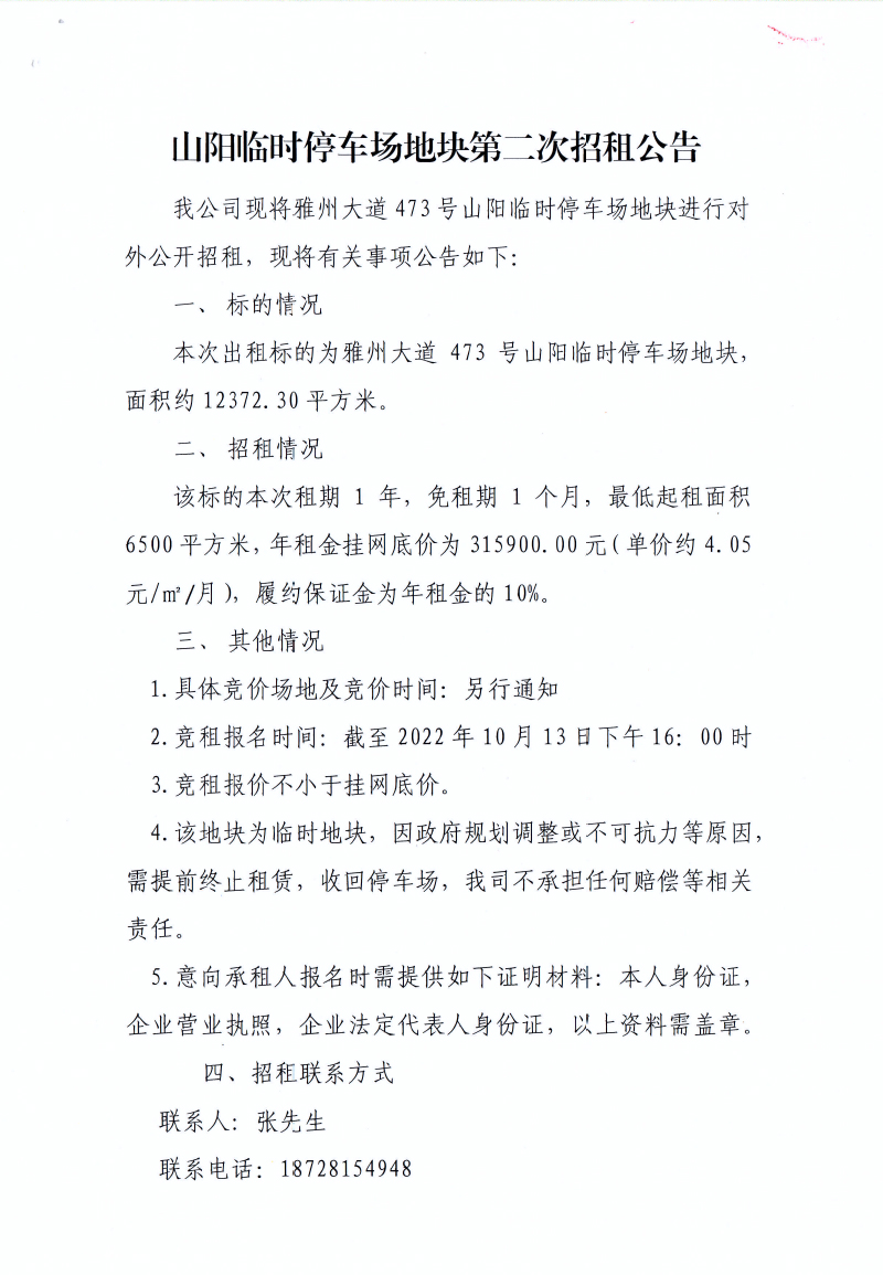 山陽臨時(shí)停車場(chǎng)地塊第二次招租公告