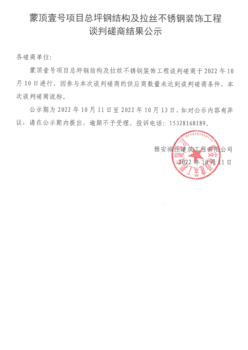 蒙頂壹號項(xiàng)目總坪鋼結(jié)構(gòu)及拉絲不銹鋼裝飾工程談判磋商結(jié)果公示