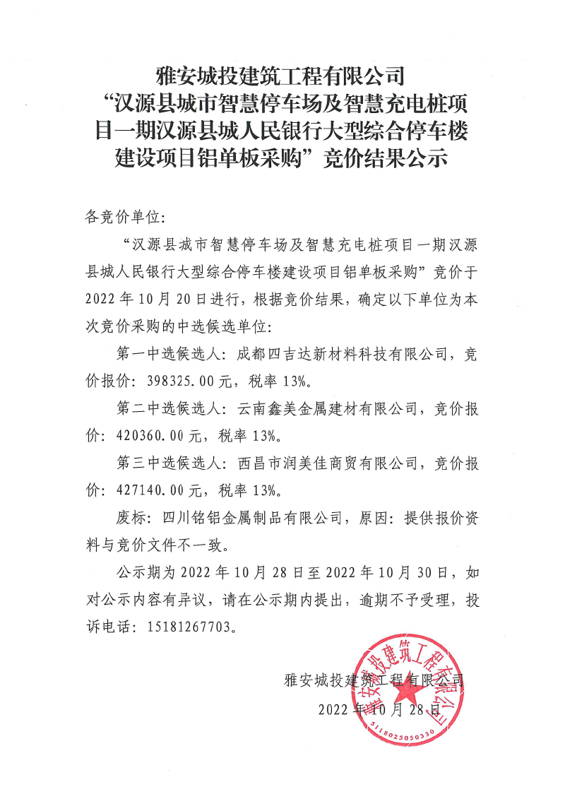 漢源縣城市智慧停車(chē)場(chǎng)及智慧充電樁項(xiàng)目一期漢源縣城人民銀行大型綜合樓停車(chē)樓建設(shè)項(xiàng)目鋁單板材料采購(gòu)競(jìng)價(jià)結(jié)果公示