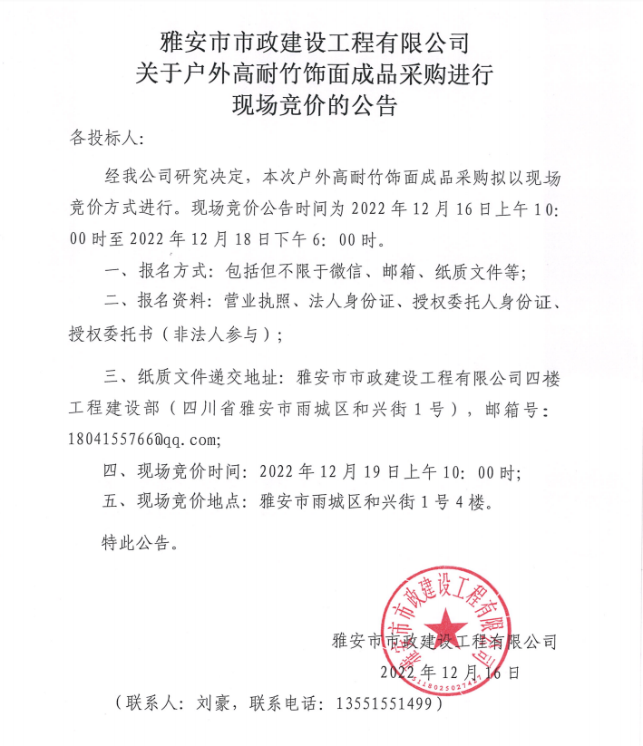 雅安市市政建設工程有限公司關于戶外高耐竹飾面成品采購進行現(xiàn)場競價公告