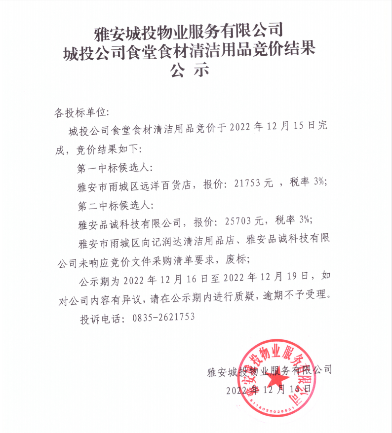 雅安城投物業(yè)服務(wù)有限公司城投公司食堂食材清潔用品競價(jià)結(jié)果公示