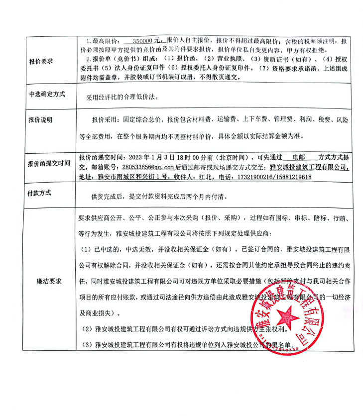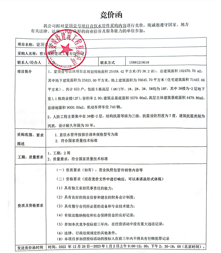 蒙頂壹號項目直飲水管件采購競價公告