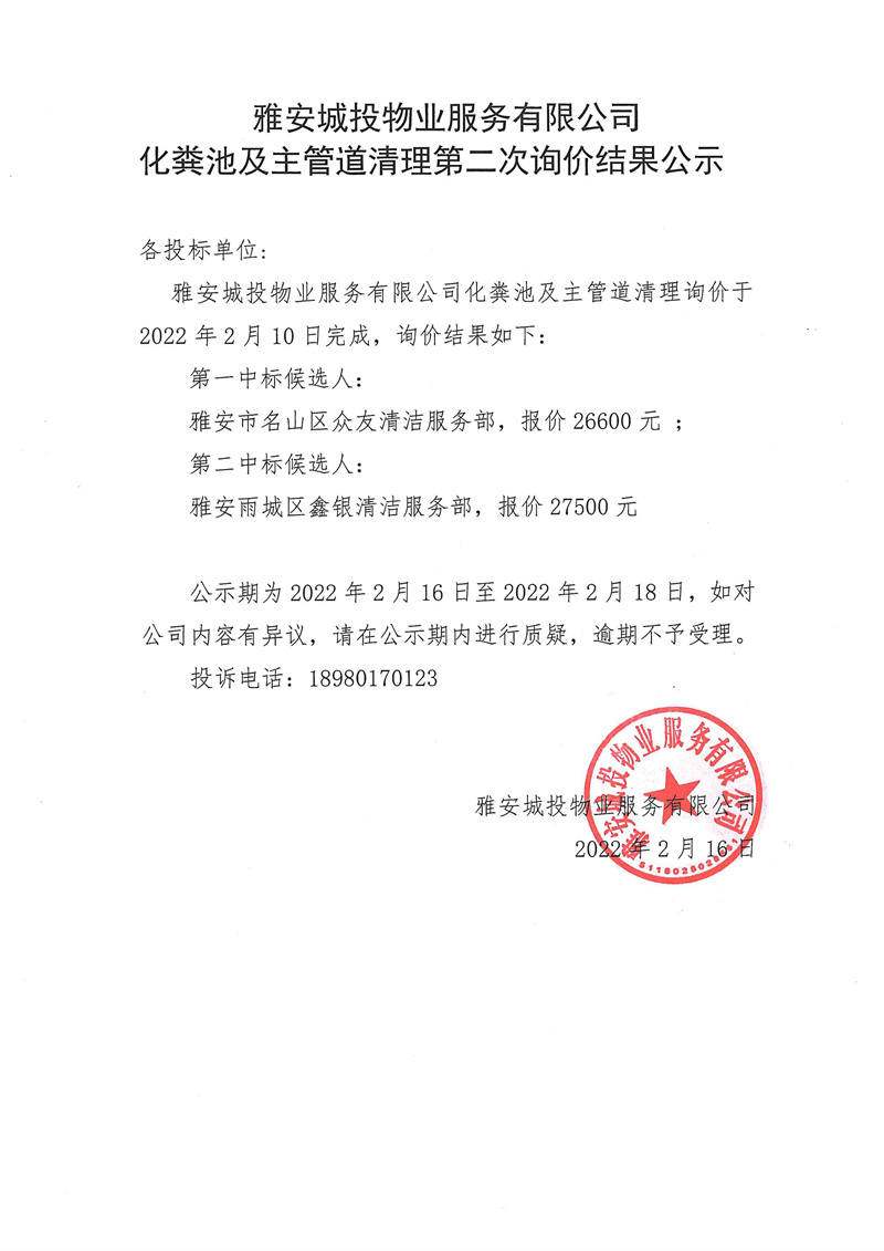 雅安城投物業(yè)服務(wù)有限公司化糞池及主管道清理詢(xún)價(jià)結(jié)果公示