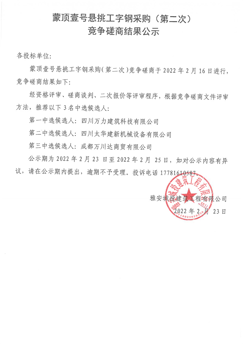 蒙頂壹號(hào)懸挑工字鋼采購(第二次)競爭磋商結(jié)果公示