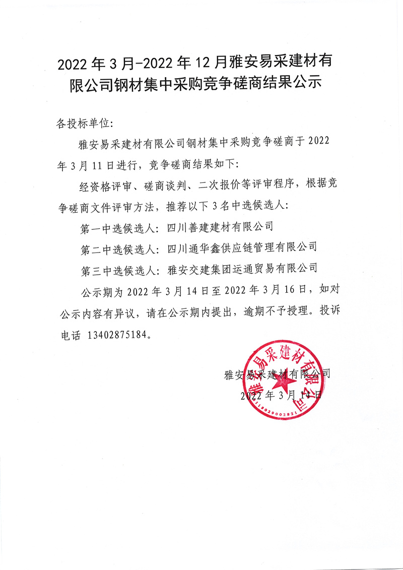 2022年3月-2022年12月雅安易采建材有限公司鋼材采購(gòu)競(jìng)爭(zhēng)磋商結(jié)果公示