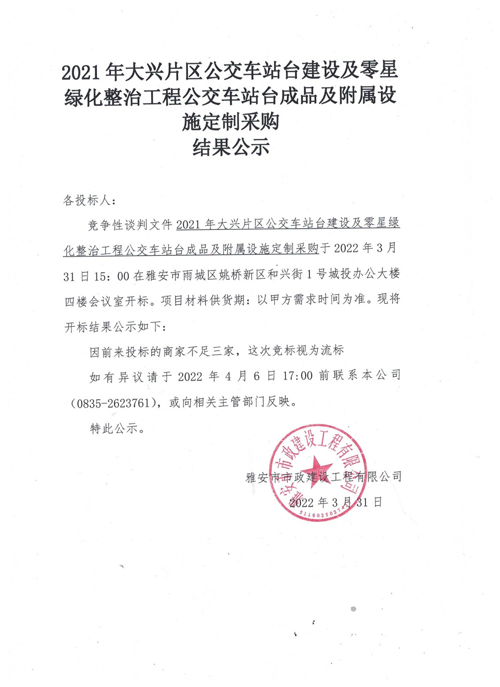 2021年大興片區(qū)公交站臺建設(shè)及零星綠地整治工程公交站臺成品及附屬設(shè)施定制采購結(jié)果公示