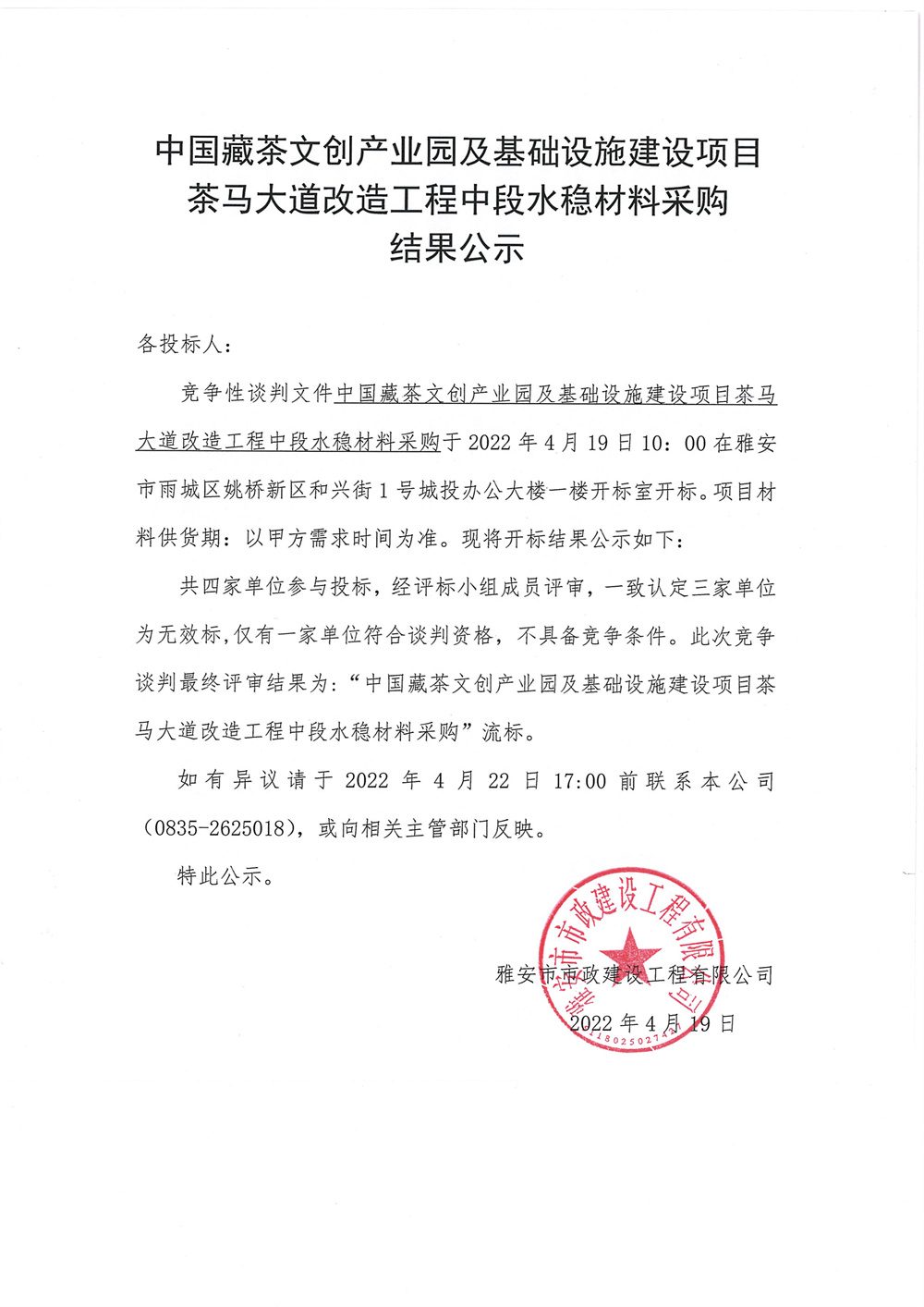市政公司中國藏茶文創(chuàng)產(chǎn)業(yè)園及基礎(chǔ)設(shè)施建設(shè)項目茶馬大道改造工程中段水穩(wěn)材料采購結(jié)果公示