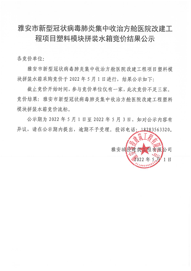 雅安市新型冠狀病毒肺炎集中收治方艙醫(yī)院改建工程項(xiàng)目塑料模塊拼裝水箱競(jìng)價(jià)結(jié)果公示