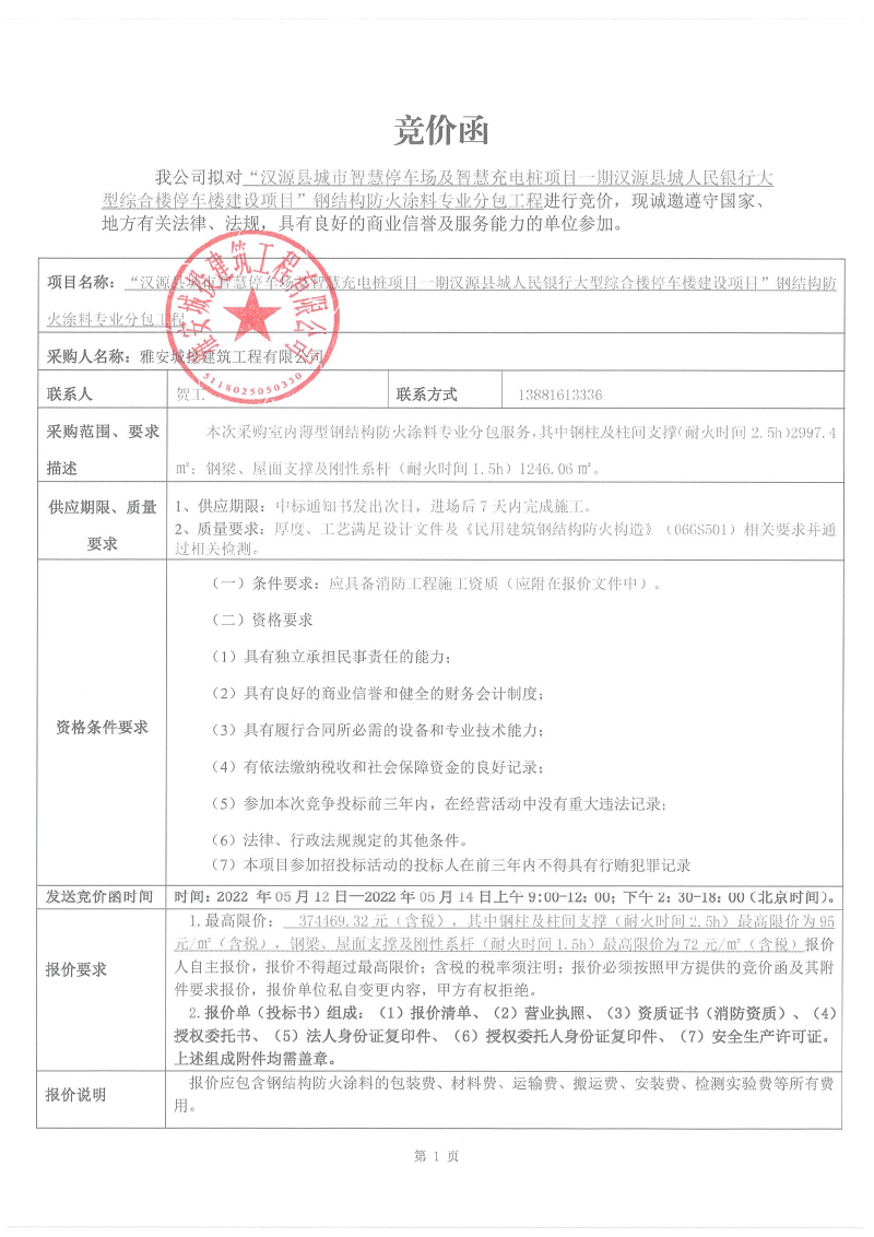 漢源縣城市智慧停車場及智慧充電樁項目一期漢源縣城人民銀行大型綜合樓停車樓建設項目防火涂料專業(yè)分包競價采購公告