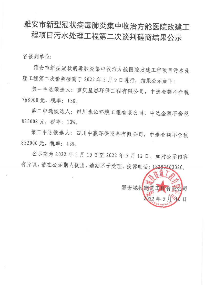 雅安市新型冠狀病毒肺炎集中收治方艙醫(yī)院改建工程項目污水處理工程第二次談判磋商結果公示