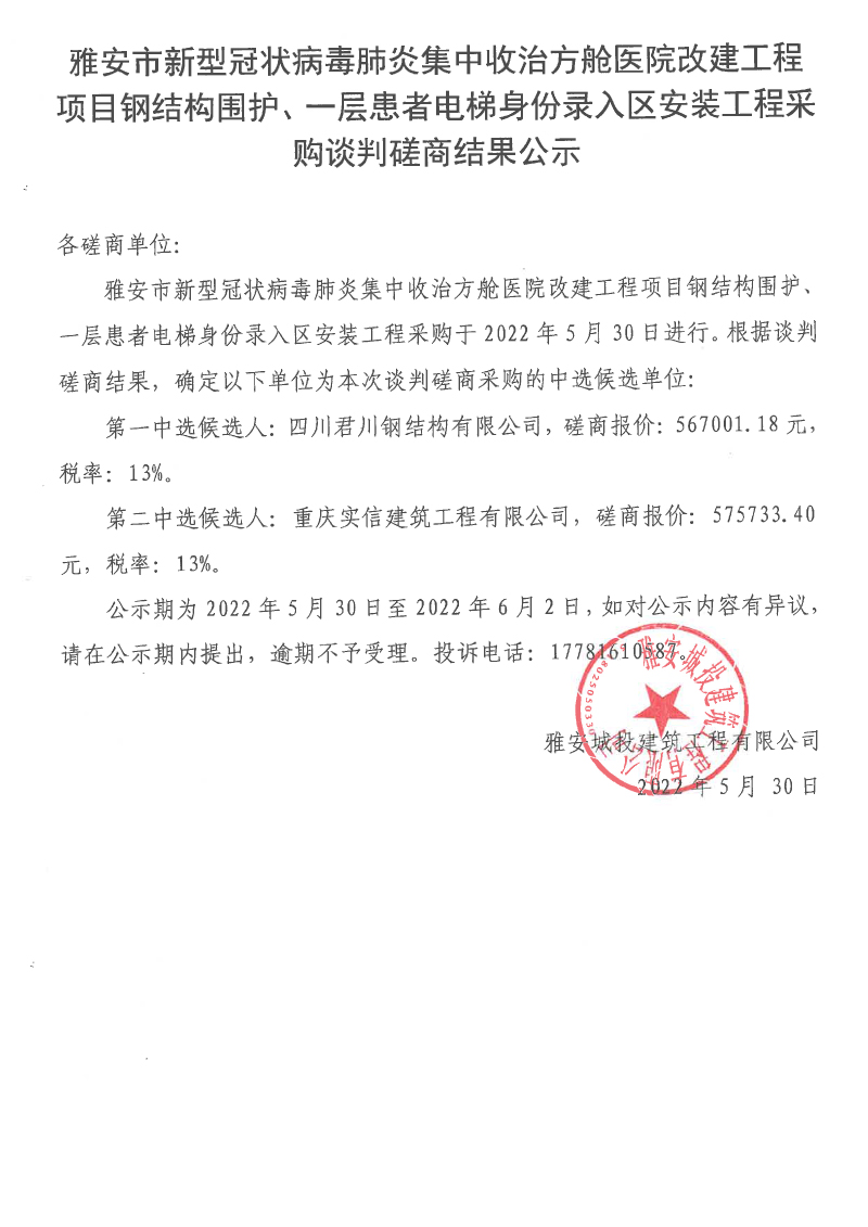雅安市新型冠狀病毒肺炎集中收治方艙醫(yī)院改建工程項目鋼結(jié)構(gòu)圍護、一層患者電梯身份錄入?yún)^(qū)安裝工程采購談判磋商結(jié)果公示