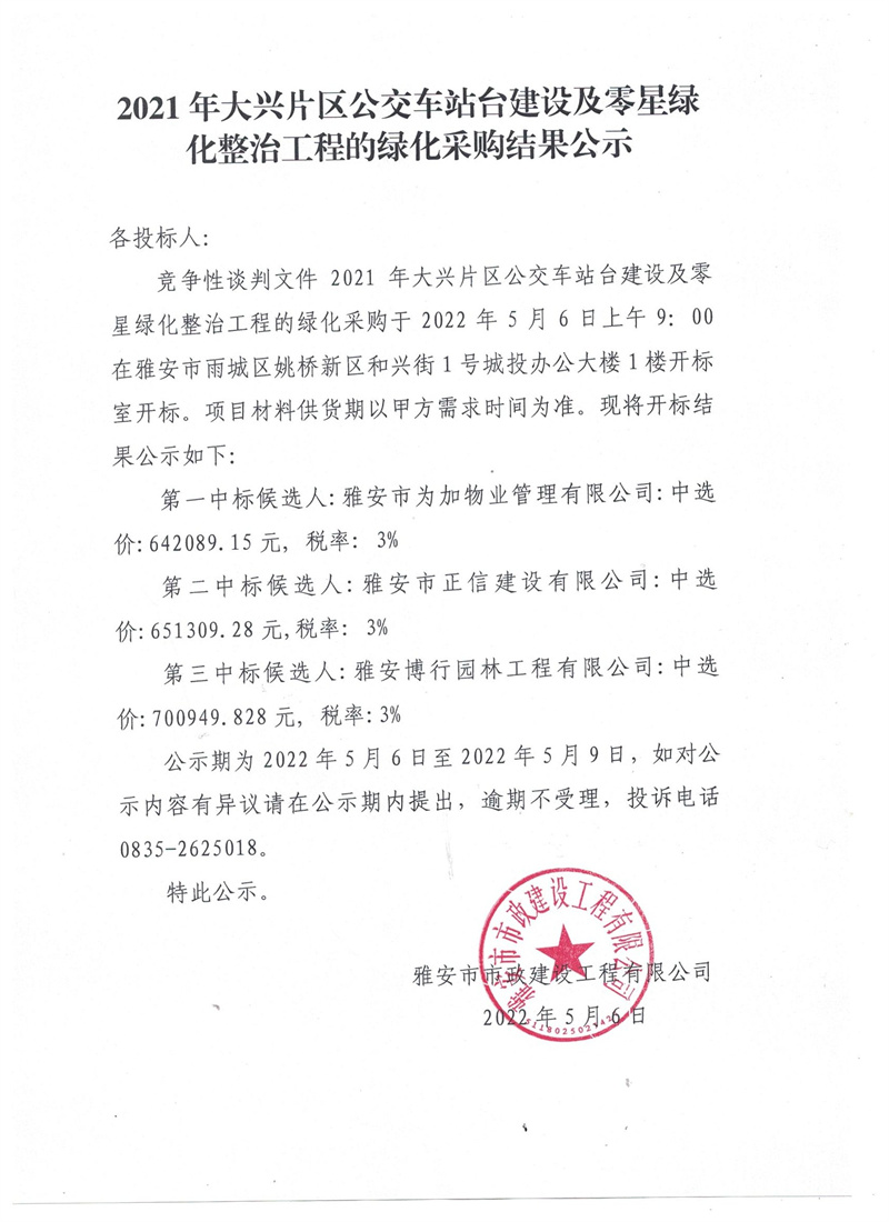 2021年大興片區(qū)公交站臺建設(shè)及零星綠地整治工程的綠化采購結(jié)果公示