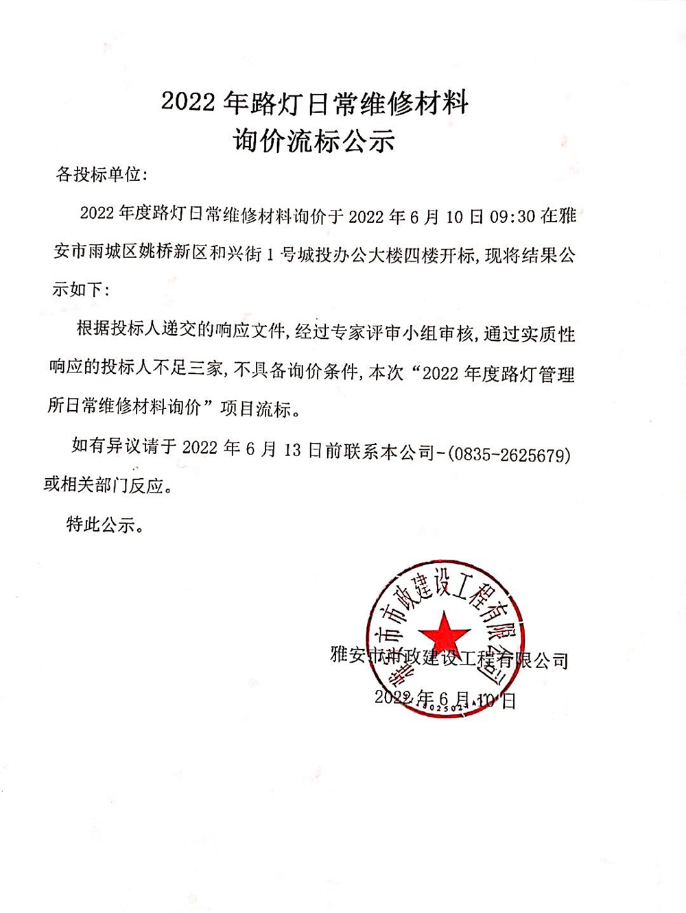2022年路燈日常維修材料詢價流標(biāo)公示