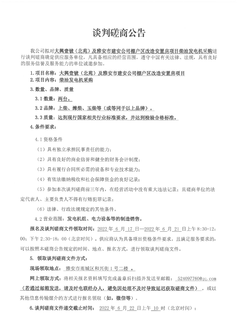 大興壹號(北苑)及雅安市建安公司棚戶區(qū)改造安置房項目柴油發(fā)電機(jī)采購談判磋商公告