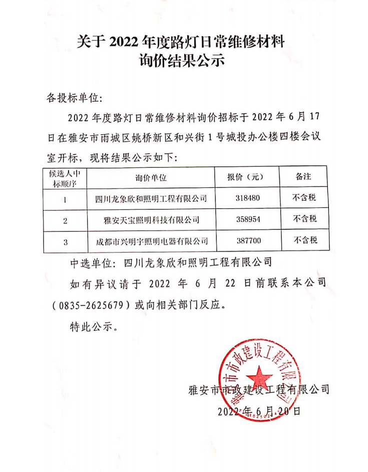 2022年路燈日常維修材料詢價結(jié)果公示