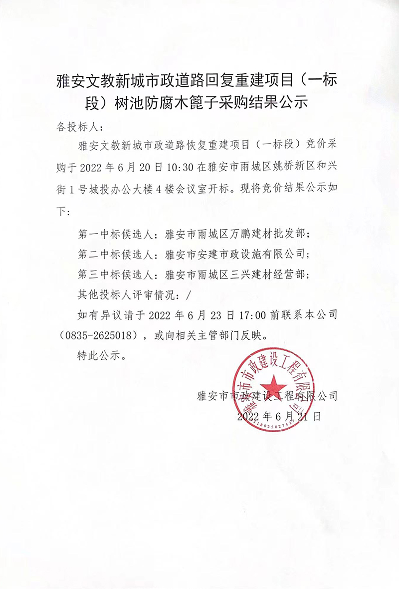 雅安市文教新城市政道路恢復(fù) 重建項目工程(一標段)樹池防腐木篦子采購結(jié)果公示