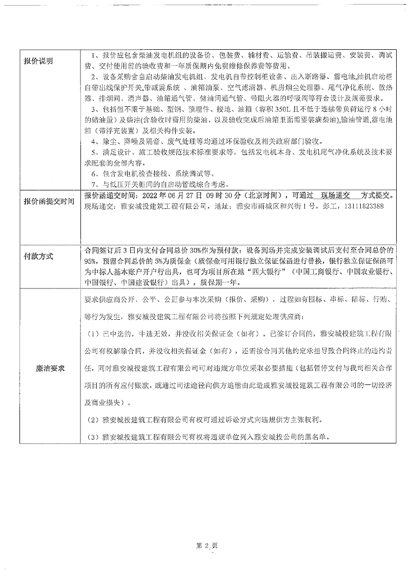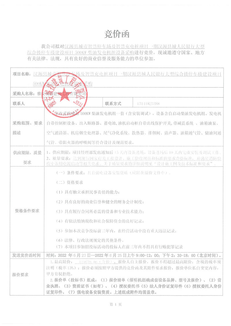 漢源縣城市智慧停車(chē)場(chǎng)及智慧充電樁項(xiàng)目一期漢源縣城人民銀行大型綜合樓停車(chē)樓建設(shè)項(xiàng)目500kw柴油發(fā)電機(jī)組設(shè)備采購(gòu)競(jìng)價(jià)公告