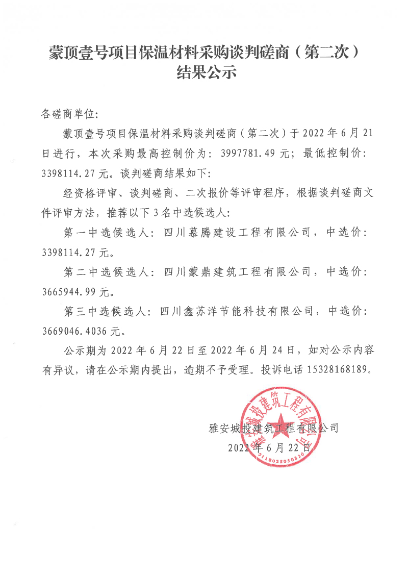 蒙頂壹號項(xiàng)目保溫材料采購談判磋商(第二次)結(jié)果公示